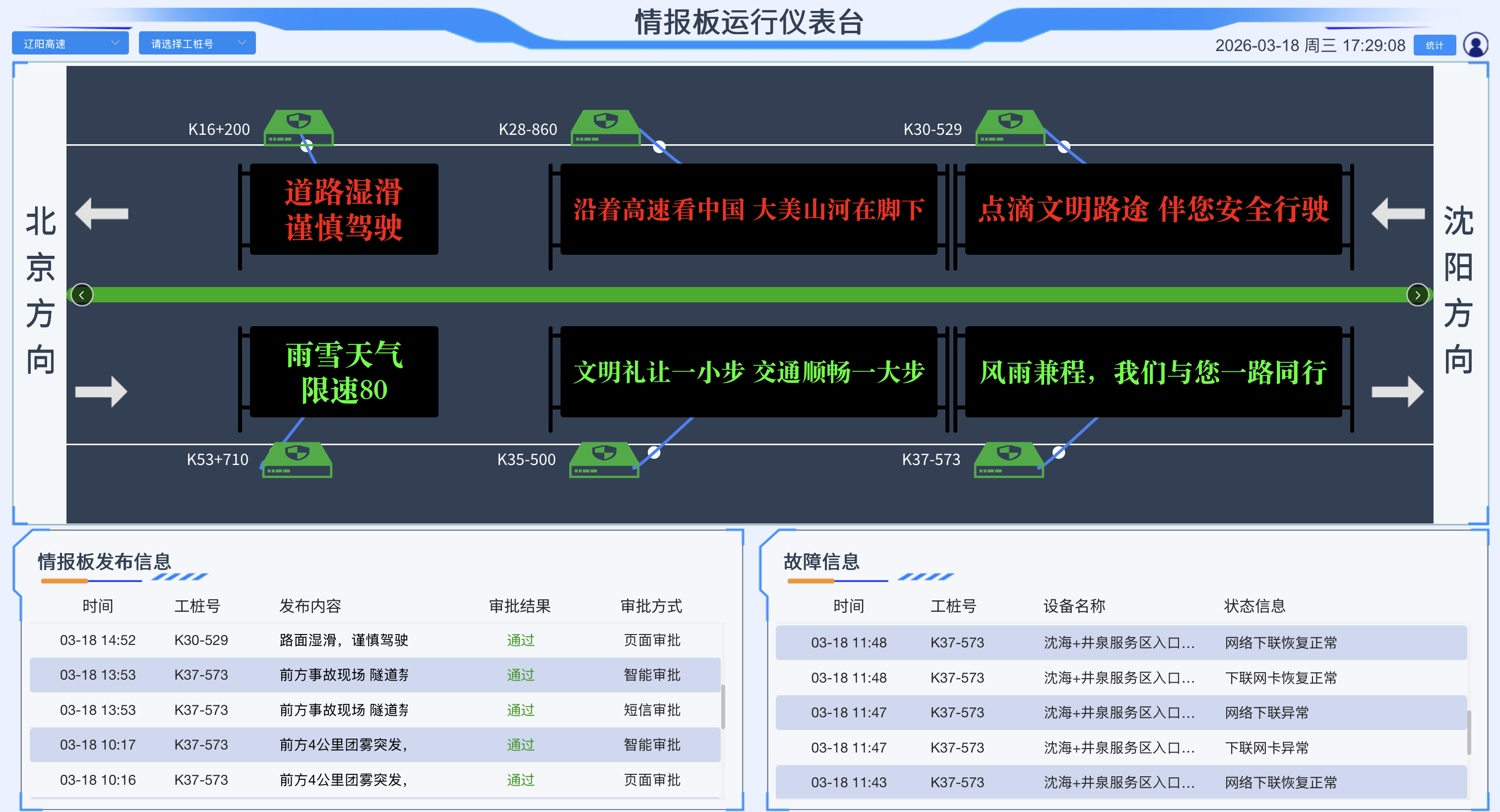 提供情报板运行状态监测大屏,与瓷器活情报板安全运维系统无缝对接,直观展示情报板运行状态。