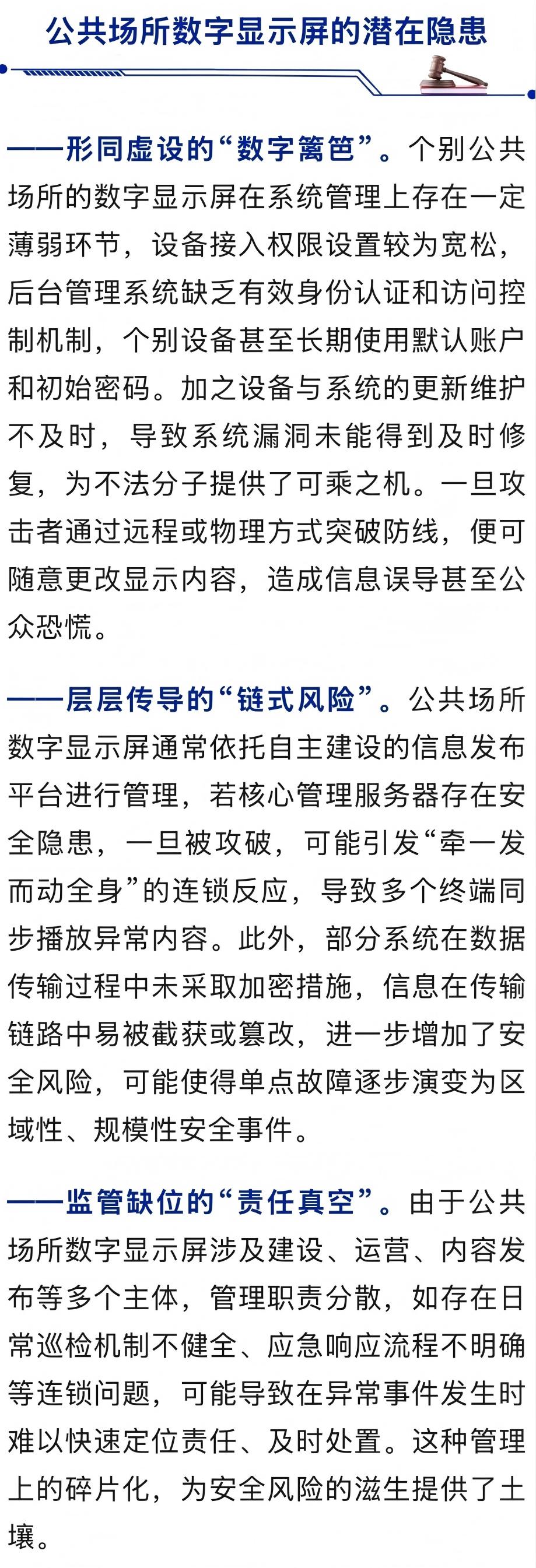 近期,境外一家购物中心的户外大型数字广告牌突然异常,连续数小时循环播放某已故知名政治活动家被篡改的、带有戏谑性和讽刺性的图片,引发业界对公共场所数字显示屏等公共数字设备潜在风险的重视。公共场所数字显示屏作为现代城市信息传播的重要载体,承担着信息发布、公益宣传、环境营造等多重功能,广泛应用于交通枢纽、商业中心、公共服务场所等人群密集区域。然而,随着互联网化、智能化程度不断提升,公共场所数字显示屏在带来便利的同时,也暴露出不容忽视的安全隐患。